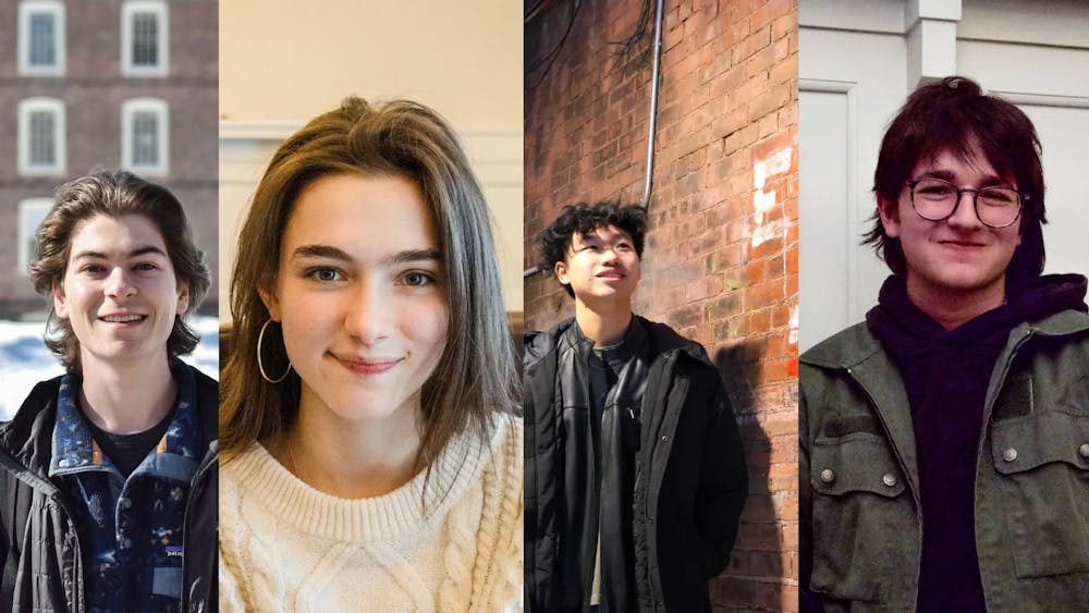 From left to right: Benny Podokshik ’28 smiling in a green jacket, Isabel Reed ’28 smiling in a close-up, David Duan ’28 smiling at an exit sign adjacent to him, Chip Mindich ’27 smiling for the camera in front of University Hall.