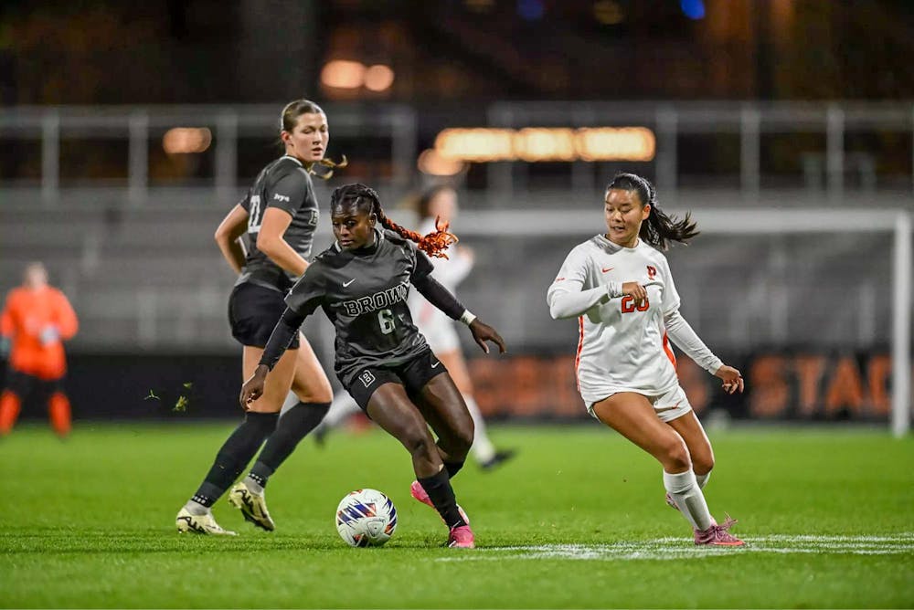 Nadja Meite ’28 steals the ball from a Princeton player. The matchup came just five days after Bruno’s previous 2-1 loss to the Tigers, the final game of the regular season.