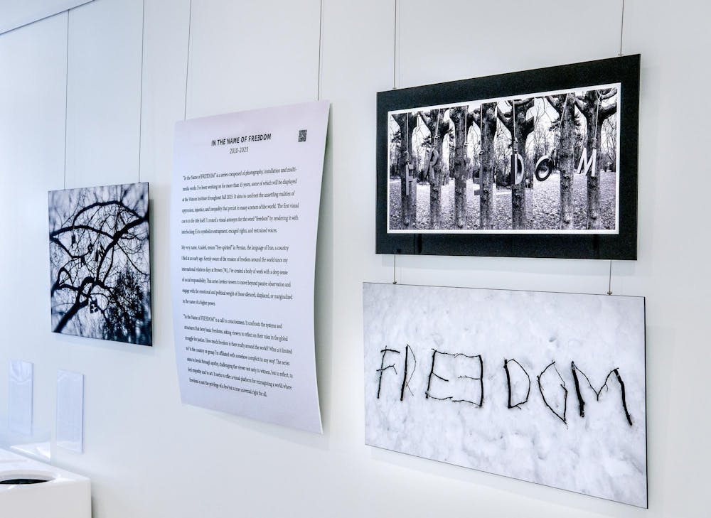 A series of physical pieces that spell the word “Freedom,” with interlocking E’s stylized to look like bars to symbolize “all the people who are not free.”
