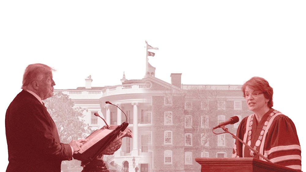 Photo of President Trump and the White House courtesy of the White House. Photo of President Christina Paxson courtesy of Brown University. Photo of University Hall courtesy of Ben Kang.