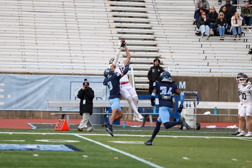 Wide receiver Ty Pezza ’26 catches a pass on Saturday. The team will look to punctuate the season with a victory when Dartmouth (7-2, 4-2 Ivy) visits on Saturday. Kickoff is slated for noon. Courtesy of Brown Athletics.